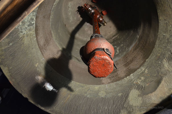 At the time, I had one arm wrapped through the rungs, only one foot on the ladder, and another bell directly behind me. The camera was in one hand and the angle so awkward I had to press the shutter release with my thumb! The ladder is so narrow and tight that I couldn't carry my camera up with me and had to pull it up after me on a rope!